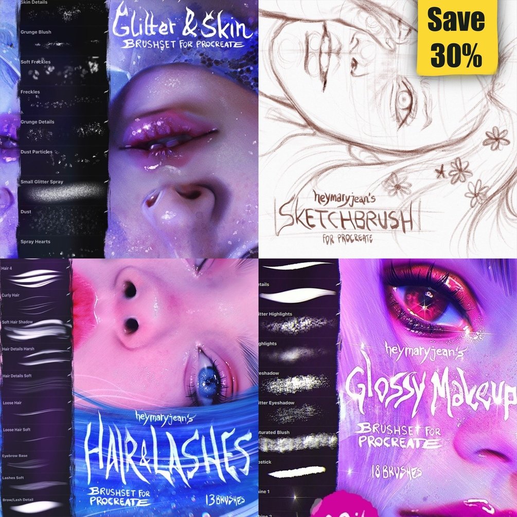 Save 30% on this 3 brushpacks, including glitter brushes, hair brushes and makeup brushes. 43 brushes in total. Free sketchbrush is included.